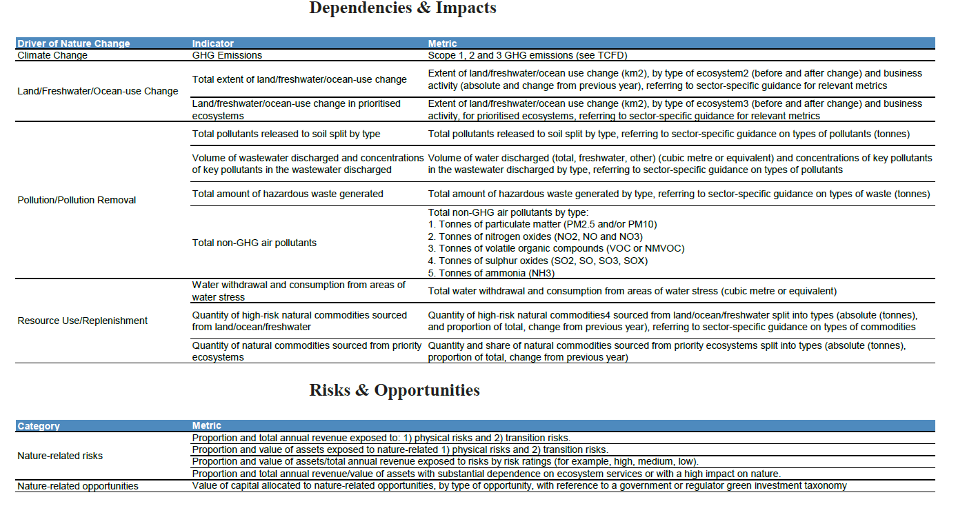 La TNFD conseille par ailleurs de publier des mesures intersectorielles qui peuvent être complétées par environ 55 indicateurs (quantité de déchets dangereux, émissions GES, eau consommée dans les zones de stress hydrique, total de polluants rejetés dans l’atmosphère...). Mais surtout la publication de la valeur du capital alloué aux opportunités liées à la nature permettrait de mettre en évidence les initiatives positives (étendue des terres, océans restaurés...). Il est intéressant que l’impact positif sur la biodiversité soit au premier plan... en identifiant les moteurs de la restauration de la nature. Ce cadre pourrait séduire certains investisseurs en vue de compléter leur portefeuille à impact positif sur la thématique biodiversité.